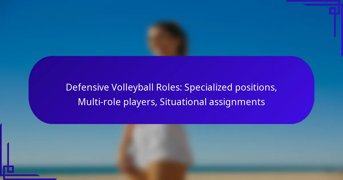 In volleyball, defensive roles are crucial for maintaining effective ball control and strategic play, primarily represented by specialised positions like the libero and defensive specialist. Multi-role players add flexibility to the defence, allowing teams to adapt to various game situations. Additionally, situational assignments enable coaches to tailor player responsibilities based on opponents’ strengths, enhancing overall team performance and resilience.